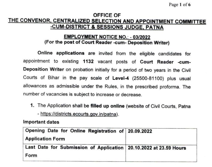 Civil Court Bihar has announced its recruitment announcement for 2022 Court Reader -cum- Deposition Writer . Qualified candidates interested in this Civil Court Bihar Court Reader -cum- Deposition Writer post will be able to apply online from September 20, 2022 through Oct 20, 2022. For recruitment eligibility, age limit, job eligibility, selection procedure, program and other information, please read the advertisement and then apply.