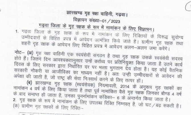 गढ़वा जिला के गृह रक्षक के रूप में नामांकन के लिए विज्ञापन।