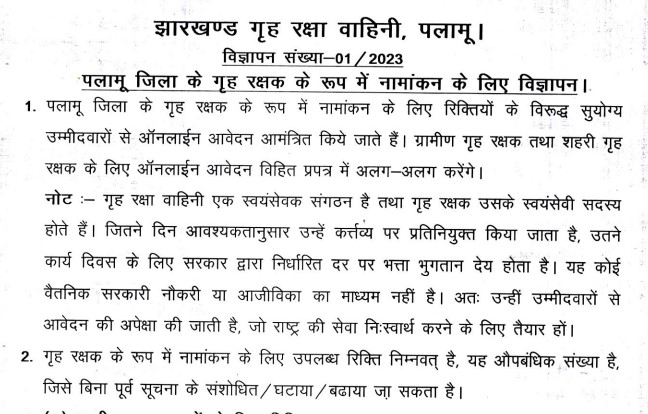 पलामू जिला के गृह रक्षक के रूप में नामांकन के लिए विज्ञापन।