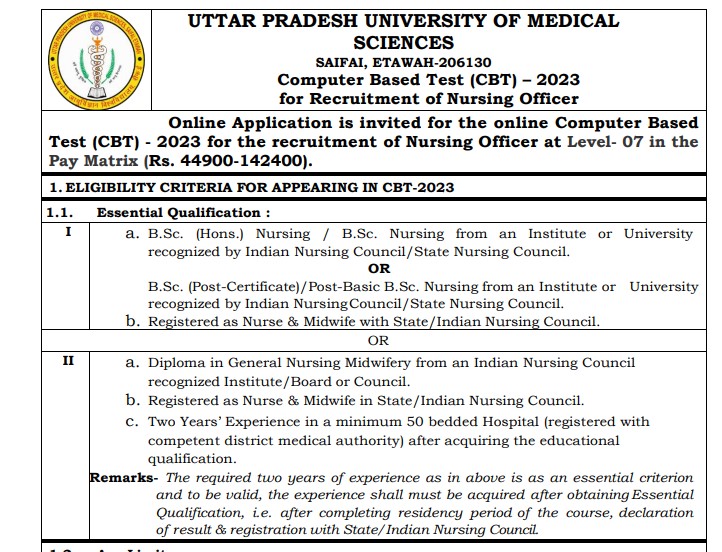 - Age Relaxation Extra as per Uttar Pradesh University of Medical Sciences Nursing Officer Recruitment Rules.