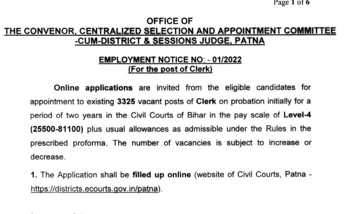 Online applications are invited from the eligible candidates for appointment to existing 3325 vacant posts of Clerk on probation initially for a period of two years in the Civil Courts of Bihar in the pay scale of Level-4 (25500-81100) plus usual allowances as admissible under the Rules in the prescribed proforma. The number of vacancies is subject to increase or decrease.