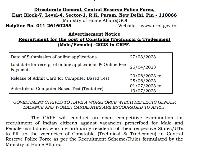 CRPF Constable Tradesman Recruitment 2023 Vacancy Total : 9212 Post