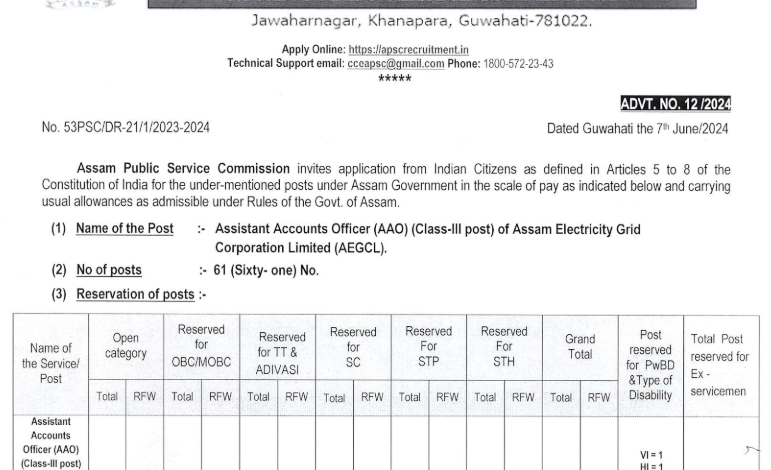 The Assam Public Service Commission (PSC) has published a notification for the recruitment of Assistant Accounts Officer (AAO) vacancies under Assam Electricity crid Corporation Limited (AEGCL). Eligible candidates who are interested in the vacancy details and have completed all eligibility criteria can read the notification & apply online.