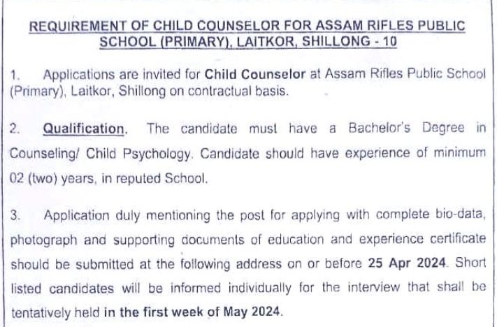 - Applications are invited for Child Counselor at Assam Rifles Public School (Primary), Laitkor, Shillong on contractual basis.