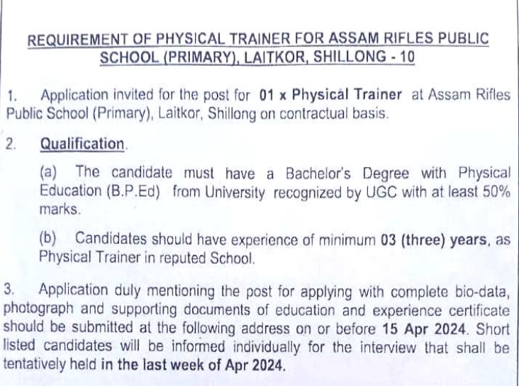 - Application invited for the post for 01 x Physical Trainer at Assam Rifles Public School (Primary), Laitkor, Shillong on contractual basis.