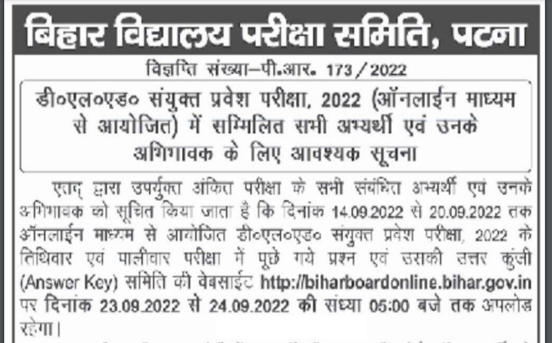 एतद् द्वारा उपर्युक्त अंकित परीक्षा के सभी संबंधित अभ्यर्थी एवं उनके अभिभावक को सूचित किया जाता है कि दिनांक 14.09.2022 से 20.09.2022 तक ऑनलाईन माध्यम से आयोजित डी०एल०एड० संयुक्त प्रवेश परीक्षा, 2022 के तिथिवार एवं पालीवार परीक्षा में पूछे गये प्रश्न एवं उसकी उत्तर कुंजी (Answer Key) समिति की वेबसाईट http://biharboardonline.bihar.gov.in पर दिनांक 23.09.2022 से 24.09.2022 की संध्या 05:00 बजे तक अपलोड रहेगा।