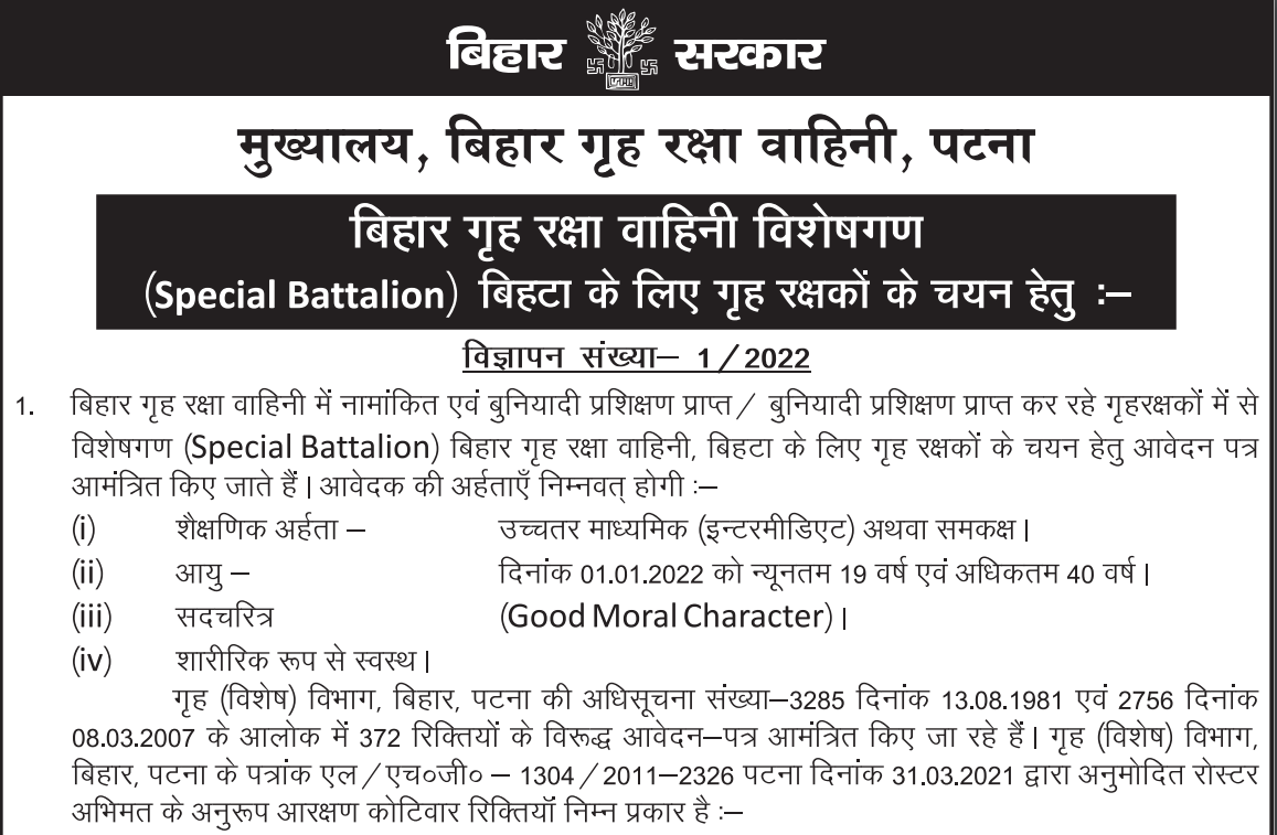 बिहार गृह रक्षा वाहिनी में नामांकित एवं बुनियादी प्रशिक्षण प्राप्त / बुनियादी प्रशिक्षण प्राप्त कर रहे गृहरक्षकों में से विशेषगण (Special Battalion) बिहार गृह रक्षा वाहिनी, बिहटा के लिए गृह रक्षकों के चयन हेतु आवेदन पत्र आमंत्रित किए जाते हैं। आवेदक की अर्हताएँ निम्नवत् होगी: