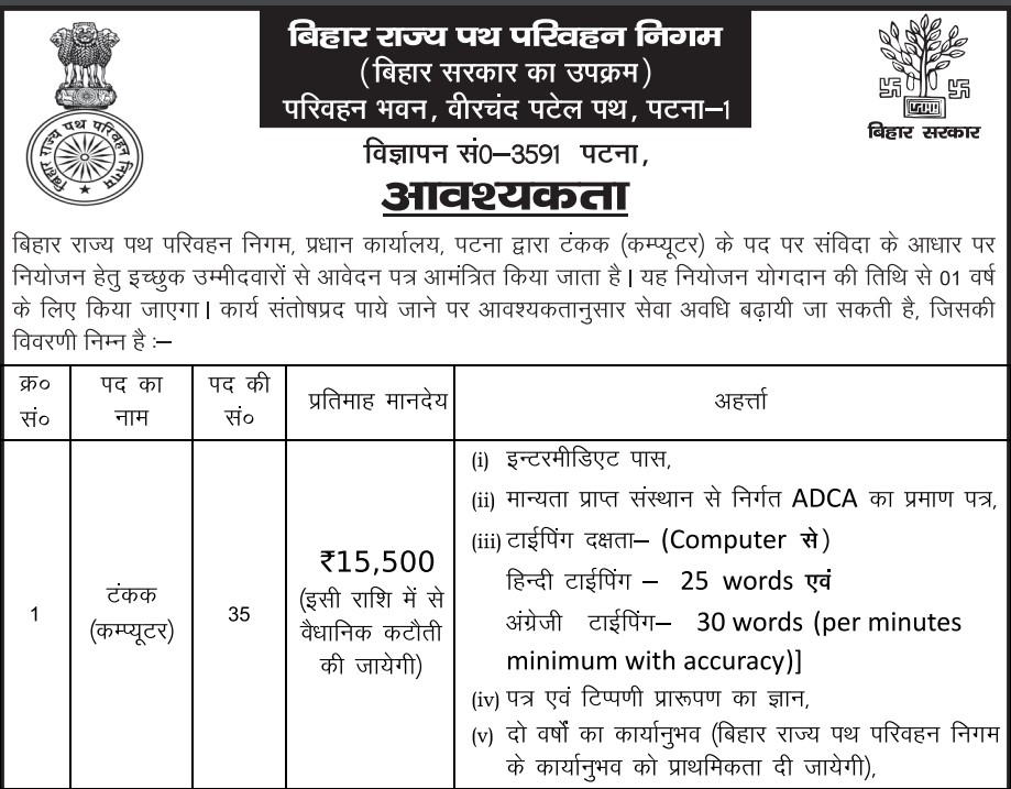 बिहार राज्य पथ परिवहन निगम प्रधान कार्यालय पटना द्वारा टंकक (कम्प्यूटर) के पद पर संविदा आधार पर नियोजन हेतु इच्छुक उम्मीदवारों से आवेदन पत्र आमंत्रित किया जाता है। यह नियोजन योगदान की तिथि से 01 वर्ष के लिए किया जाएगा । कार्य संतोषप्रद पाये जाने पर आवश्यकतानुसार सेवा अवधि बढ़ायी जा सकती है, जिसकी का विवरणी निम्न हैं: