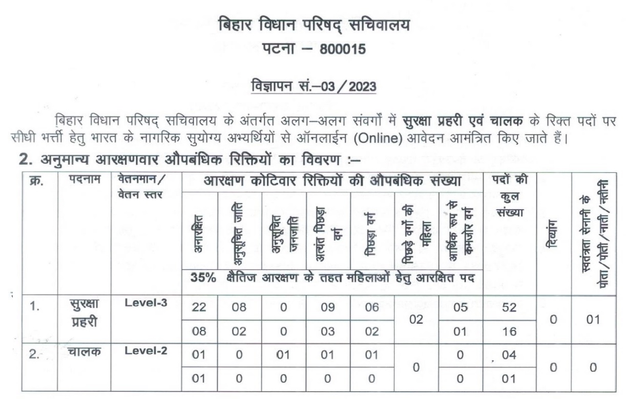 बिहार विधान परिषद् सचिवालय के अंतर्गत अलग-अलग संवर्गों में सुरक्षा प्रहरी एवं चालक के रिक्त पदों पर भर्ती के लिए आयोजित होने वाली प्रतियोगिता परीक्षा हेतु विज्ञापन संख्या-03/2023 का प्रकाशन बिहार विधान परिषद् सचिवालय द्वारा किया गया है, जिसे परिषद् के वेबसाईट www.biharvidhanparishad.gov.in पर देखा जा सकता है ।