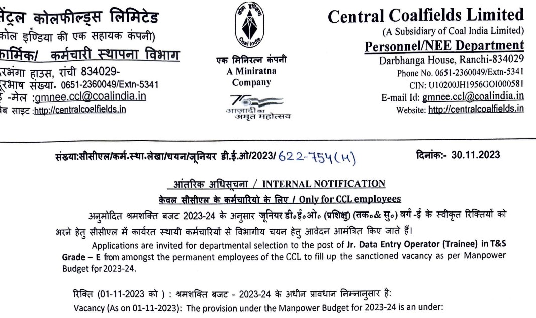 Applications are invited for departmental selection to the post of Jr. Data Entry Operator (Trainee) in T&S Grade E from amongst the permanent employees of the CCL to fill up the sanctioned vacancy as per the Manpower Budget for 2023–24.
