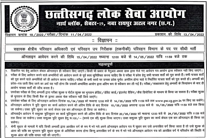- Chhattisgarh Public Service Commission CGPSC Sahayak Kshetriya Privahan Adhikari & Parivahan UP Nirikshak (TECH.) – Recruitment 2021. Notification and Invited Online Application Form for the Latest CGPSC ADVERTISEMENT FOR ARTO & TSI Jobs 2022 Candidate Can Apply Online for 15/04/2022 to 15/05/2022.