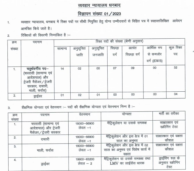 व्यवहार न्यायालय, धनबाद में रिक्त पदों पर सीधी नियुक्ति हेतु योग्य उम्मीदवारों से विहित पत्र में स्वहस्तलिखित आवेदन आमंत्रित किये जाते हैं।