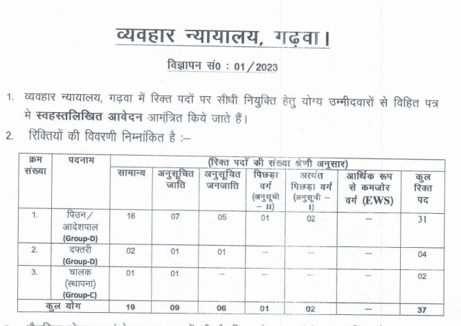 व्यवहार न्यायालय, गढ़वा रिक्तियों की विवरणी निम्नांकित है:- 37 Posts