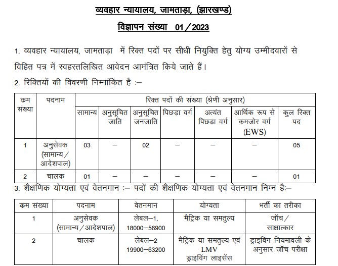 व्यवहार न्यायालय, जामताड़ा में रिक्त पदों पर सीधी नियुक्ति हेतु योग्य उम्मीदवारों से विहित पत्र में स्वहस्तलिखित आवेदन आमंत्रित किये जाते हैं।