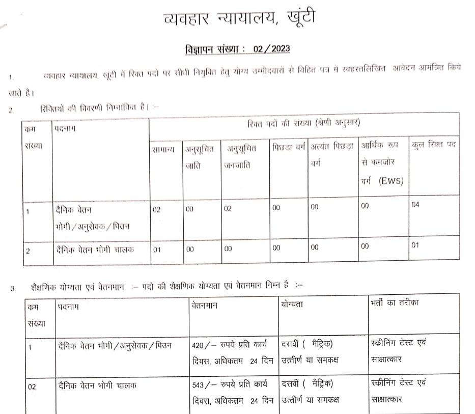 - рдЙрдореНрдореАрджрд╡рд╛рд░ рдЕрдкрдирд╛ рд╕реНрд╡рд╣рд╕реНрддрд▓рд┐рдЦрд┐рдд рдЖрд╡реЗрджрди рдкрддреНрд░ рдПрд╡рдВ рдкреНрд░рд╡реЗрд╢ рдкрддреНрд░ рджреЗрд╡рдирд╛рдЧрд░реА рд▓рд┐рдкрд┐ рдореЗрдВ рдкреНрд░рдзрд╛рди рдЬрд┐рд▓рд╛ рдПрд╡рдВ рд╕рддреНрд░ рдиреНрдпрд╛рдпрд╛рдзреАрд╢, рдЦреВрдБрдЯреА рдХреЛ рд╕рдореНрдмреЛрдзрд┐рдд рдХрд░рддреЗ рд╣реБрдП рд╡рд┐рд╣рд┐рдд рдкреНрд░рд╛рд░реВрдк рдореЗрдВ рдЕрдзреЛрд╣рд╕реНрддрд╛рдХреНрд╖рд░реА рдХреЗ рдХрд╛рд░реНрдпрд╛рд▓рдп рдореЗрдВ рджрд┐рдирд╛рдВрдХ 28-02-2023 рдХреЗ рдЕрдВрджрд░ рддрдХ рд╕реНрд╡рдпрдВ рдпрд╛ рдирд┐рдмрдВрдзрд┐рдд рдбрд╛рдХ/ рд╕реНрдкреАрдб рдкреЛрд╕реНрдЯ рджреНрд╡рд╛рд░рд╛ рдХрд╛рд░реНрдп рджрд┐рд╡рд╕ рдХреЛ рдкреНрд░рд╛рддрдГ 10:30 рдмрдЬреЗ рд╕реЗ рд╢рд╛рдо 05:00 рдмрдЬреЗ рддрдХ рдЬрдорд╛ рдХрд░ рд╕рдХрддреЗ рд╣реИрдВред рдЙрдкрд░реЛрдХреНрдд рддрд┐рдерд┐ рдХреЗ рдЙрдкрд░рд╛рдВрдд рдкреНрд░рд╛рдкреНрдд рд╣реЛрдиреЗ рд╡рд╛рд▓реЗ рдЖрд╡реЗрджрди рдкрддреНрд░ рд╕реНрд╡реАрдХрд╛рд░ рдирд╣реАрдВ рдХрд┐рдпреЗ рдЬрд╛рдпреЗрдВрдЧреЗ
