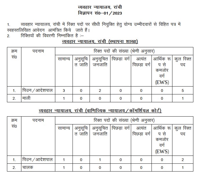 व्यवहार न्यायालय, रांची (स्थापना शाखा) रिक्तियों की विवरणी निम्नांकित है:- 06 Posts