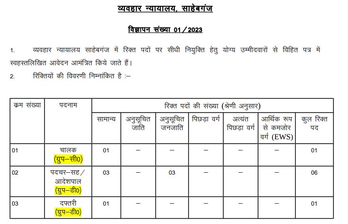 व्यवहार न्यायालय, साहिबगंज , (झारखण्ड) में रिक्त पदों पर सीधी नियुक्ति हेतु योग्य उम्मीदवारों से विहित पत्र में स्वहस्तलिखित आवेदन आमंत्रित किये जाते हैं।