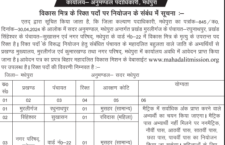 सदर अनुमण्डल, मधेपुरा अन्तर्गत प्रखंड मुरलीगंज के पंचायत रघुनाथपुर, प्रखंड सिंहेश्वर के पंचायत-सुखासन एवं नगर परिषद्, मधेपुरा के वार्ड नं0-22 में विकास मित्र के मृत्यु के उपरान्त पद रिक्त है। रिक्त पदों के विरूद्ध नियोजन हेतु संबंधित पंचायत के महादलित बहुलता वाले जाति के अभ्यर्थियों से प्रखण्ड मुख्यालय, मुरलीगंज एवं कुमारखण्ड तथा नगर परिषद्, मधेपुरा में कार्यालय अवधि में आवेदन प्राप्त किया जाना है। आवेदन पत्र का प्रपत्र बिहार महादलित विकास मिशन के वेबासाईट www.mahadalitmission.org पर उपलब्ध है। रिक्त पदों की विवरणी निम्नवत है:-