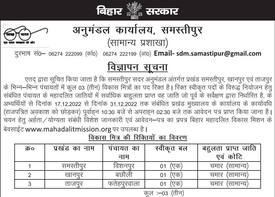 समस्तीपुर सदर अनुमंडल अंतर्गत प्रखंड समस्तीपुर, खानपुर एवं ताजपुर के भिन्न-भिन्न पंचायतों में कुल 03 (तीन) विकास मित्रों का पद रिक्त है। रिक्त स्वीकृत पदों के विरुद्ध नियोजन हेतु संबंधित पंचायत के महादलित जातियों में सर्वाधिक बाहुलता प्राप्त वह जाति जो पूर्व के सर्वेक्षण द्वारा निर्धारित है, के अभ्यर्थियों से दिनांक 17.12.2022 से दिनांक 31.12.2022 तक संबंधित प्रखंड मुख्यालय के कार्यालय के कार्यावधि (राजपत्रित अवकाश को छोड़कर) पूर्वाह्न 10:30 बजे से अपराह्न 02:30 बजे तक आवेदन पत्र प्राप्त किया जाना है। चयन हेतु अर्हता / योग्यता संबंधी विशेश जानकारी एवं आवेदन-पत्र का प्रपत्र बिहार महादलित विकास मिशन के बेवसाईट www.mahadalitmission.org पर उपलब्ध है।