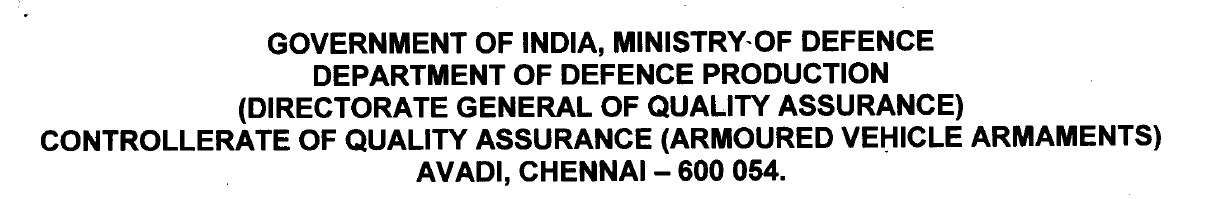 Place of Work : CONTROLLERATE OF QUALITY ASSURANCE (ARMOURED VEHICLE ARMAMENTS ), AVADI CHENNAI – 600054