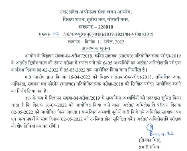 Junior Assistant General Recruitment Competitive Examination 2019 DV Letter