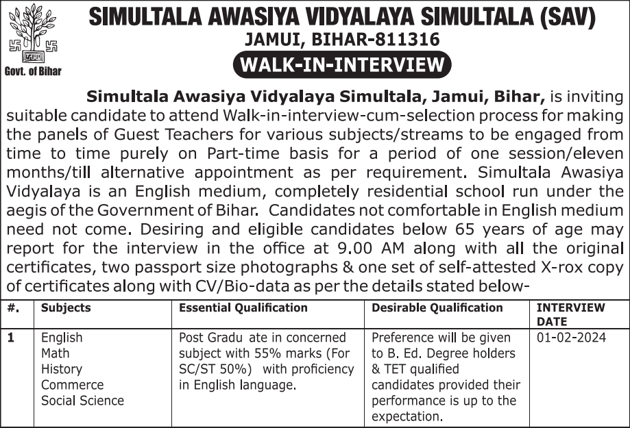 बोकारो जिलान्तर्गत संचालित नेताजी सुभाष चंद्र बोस आवासीय विद्यालय में शिक्षिकाओं के चयन शैक्षणिक योग्यता