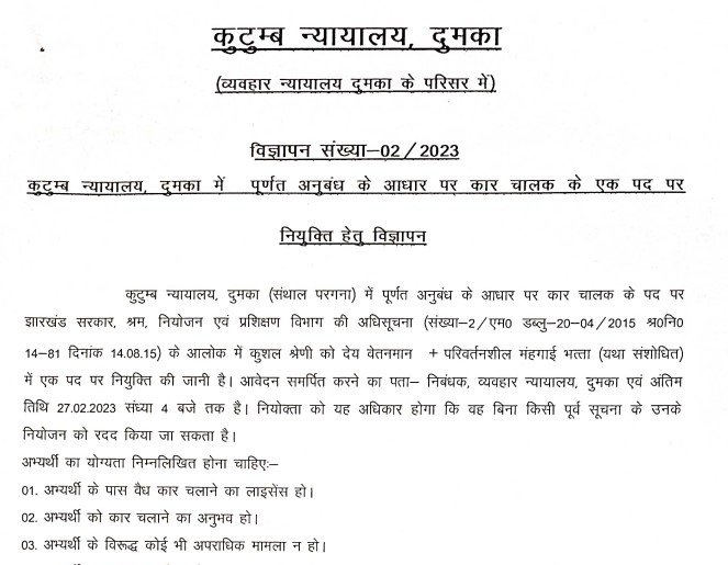 कुटुम्ब न्यायालय, दुमका में पूर्णत अनुबंध के आधार पर कार चालक के एक पद पर नियुक्ति हेतु विज्ञापन