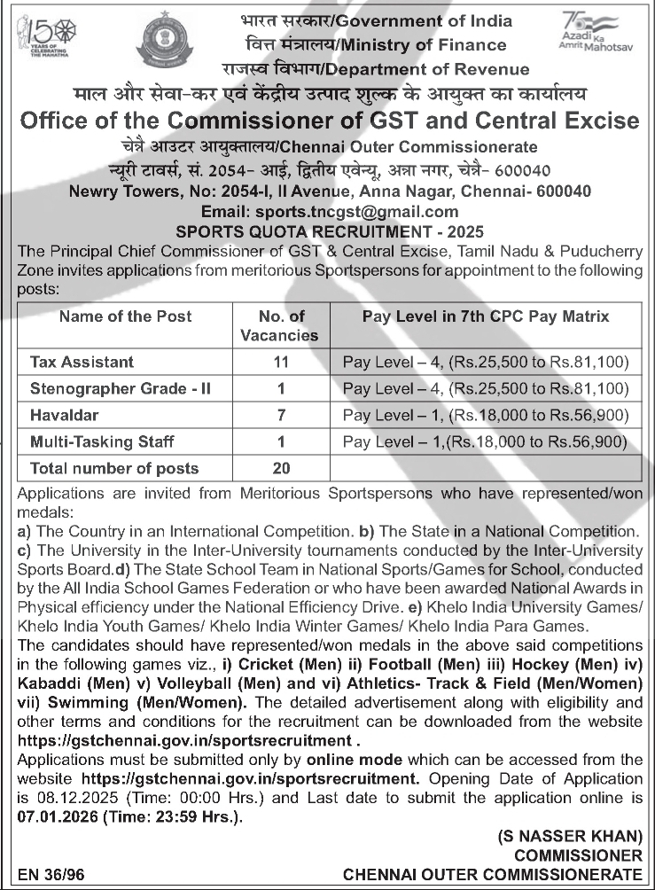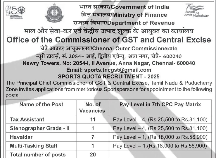 There is one piece of good news come from the Office of the Principal Chief Commissioner of GST & Central Excise, Tamil Nadu & Puducherry Zone, Chennai, invites online applications from meritorious sportspersons under the sports quota for recruitment to the posts of tax assistant, stenographer grade II, havaldar, and multi-tasking staff. Eligible sportspersons can apply online from 08th December 2025 to 07th January 2026.