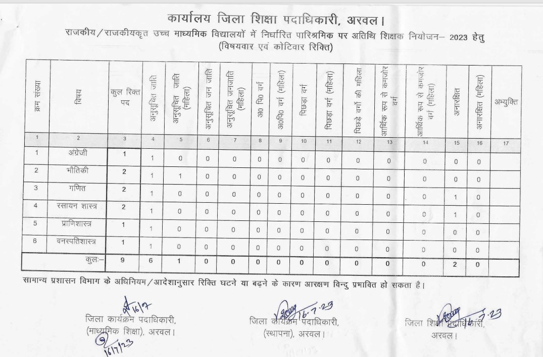 अरवल जिला अंतर्गत उच्च माध्यमिक विद्यालयों में गणित / भौतिकी/ अंग्रेजी / रसायनशास्त्र / प्राणी शास्त्र / वनस्पतिशास्त्र विषय में अंतिथि शिक्षक के रूप में सेवा देने हेतु वैसे अभ्यर्थी जिन्होने दिनांक- 17.07.2023 से 20.07.2023 तक आवेदन समर्पित किया है, उनका मेधा सूची 22 जुलाई 2023 को NIC के वेबसाईट पर अपलोड कर दिया गया है। संबंधित अभ्यर्थी मेघा सूची पर आपत्ति दिनांक 24.07.2023 को पूर्वाहन 10:00 बजे से अपराह्न 04:00 बजे तक की अवधि में उमैराबाद उच्च विद्यालय, अरवल में दर्ज करा सकते है समयावधि के समाप्ति के उपरान्त प्राप्त आपत्ति पर विचार नहीं किया जायेगा।