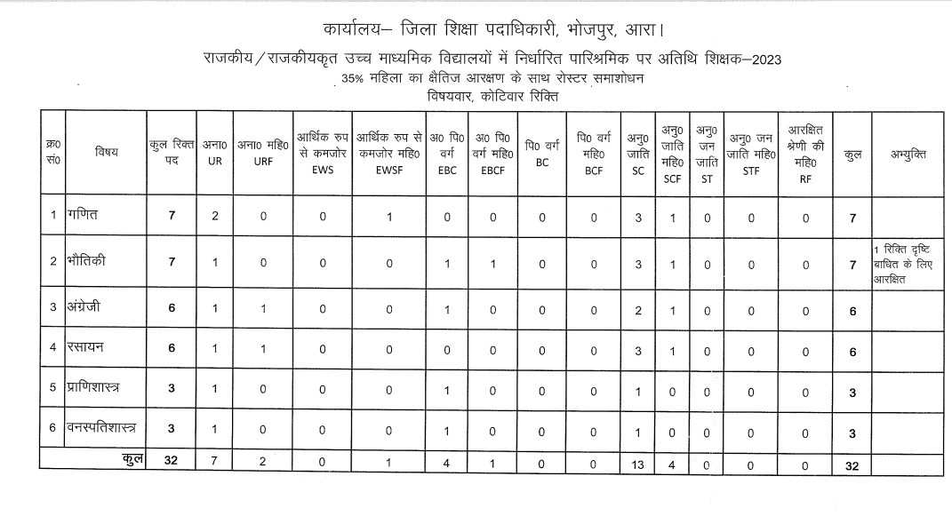 Bhojpur Subjectwise Guest Teacher Vacancy Deatails :-