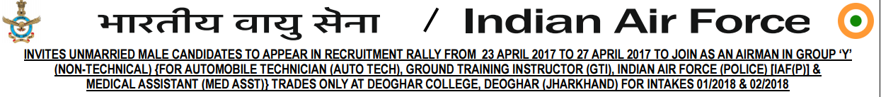 INVITES UNMARRIED MALE CANDIDATES TO APPEAR IN RECRUITMENT RALLY FROM 23 APRIL 2017 TO 27 APRIL 2017 TO JOIN AS AN AIRMAN IN GROUP ‘Y’ (NON-TECHNICAL) {FOR AUTOMOBILE TECHNICIAN (AUTO TECH), GROUND TRAINING INSTRUCTOR (GTI), INDIAN AIR FORCE (POLICE) [IAF(P)] & MEDICAL ASSISTANT (MED ASST)} TRADES ONLY AT DEOGHAR COLLEGE, DEOGHAR (JHARKHAND) FOR INTAKES 01/2018 & 02/2018