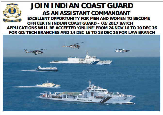 AS AN ASSISTANT COMMANDANT EXCELLENT OPPORTUNITY FOR MEN AND WOMEN TO BECOME OFFICER IN INDIAN COAST GUARD ??? 02/2017 BATCH APPLICATIONS WILL BE ACCEPTED ‘ONLINE’ FROM 24 NOV 16 TO 10 DEC 16 FOR GD/TECH BRANCHES AND 14 DEC 16 TO 18 DEC 16 FOR LAW BRANCH