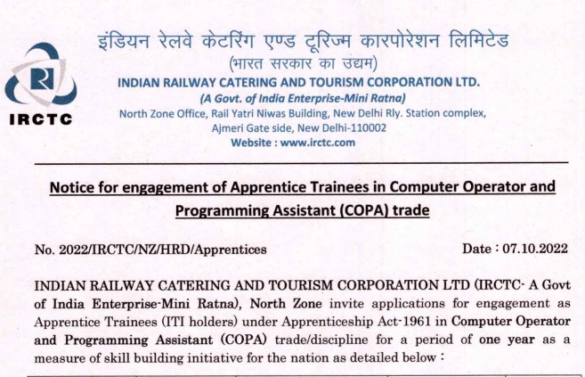 INDIAN RAILWAY CATERING AND TOURISM CORPORATION LTD (IRCTC- A Govt of India Enterprise-Mini Ratna), North Zone invite applications for engagement as Apprentice Trainees (ITI holders) under Apprenticeship Act-1961 in Computer Operator and Programming Assistant (COPA) trade/discipline for a period of one year as a measure of skill building initiative for the nation as detailed below:
