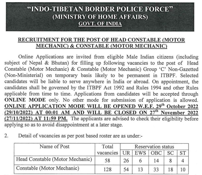 Indo Tibetan Border Police Force invites online applications from eligible Indian citizens (Male & Female) (including subject of Nepal & Bhutan) to fill up vacancies of Constable (Tradesman) Group ‘C’ Non-Gazetted (Non-Ministerial) on temporary basis likely to be permanent in ITBPF in pay scale, Level-3 in the Pay Matrix Rs. 21700-69100 (as per 7th CPC). Selected candidates will be liable to serve anywhere in India or abroad. The applicants are advised to check their eligibility before applying so as to avoid disappointment at a later stage.