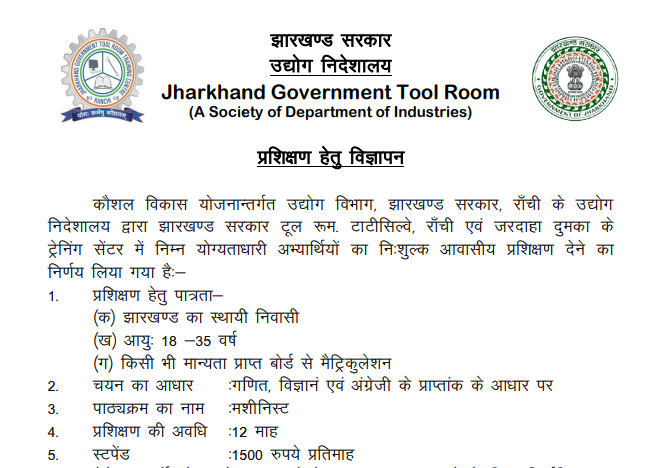 कौशल विकास योजनान्तर्गत उद्योग विभाग, झारखण्ड सरकार, राँची के उद्योग निदेशालय द्वारा झारखण्ड सरकार टूल रूम. टाटीसिल्वे, राँची एवं जरदाहा दुमका के ट्रेनिंग सेंटर में निम्न योग्यताधारी अभ्यार्थियों का निःशुल्क आवासीय प्रशिक्षण देने का निर्णय लिया गया हैः-