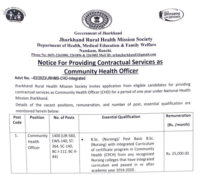 Jharkhand Rural Health Mission Society invites application from eligible candidates for prividing contractual services as Community Health Officer (CHO) for a period of one year under National Health Mission Jharkhand.