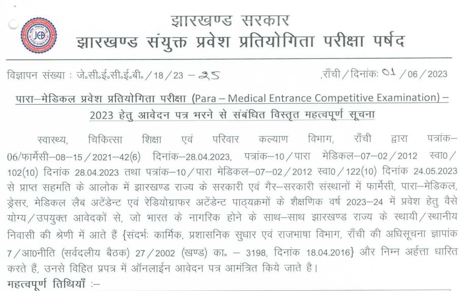 झारखण्ड राज्य के सरकारी एवं गैर-सरकारी संस्थानों में फार्मेसी, पारा मेडिकल, ड्रेसर, मेडिकल लैब अटेडेन्ट एवं रेडियोग्राफर अटेंडेन्ट पाठ्यक्रमों को शैक्षणिक वर्ष 2023-24 में प्रवेश हेतु वैसे योग्य उपयुक्त आवेदकों से जो भारत के नागरिक होने के साथ-साथ झारखण्ड राज्य के स्थायी / स्थानीय निवासी की श्रेणी में आते है (संदर्भः कार्मिक, प्रशासनिक सुधार एवं राजभाषा विभाग, राँची की अधिसूचना ज्ञापांक 7/ आनीति (सर्वदलीय बैठक ) 27 / 2002 ( खण्ड) का. 3198, दिनांक 18.04.2016) और निम्न अर्हता धारित करते हैं. उनसे विहित प्रपत्र में ऑनलाईन आवेदन पत्र आमंत्रित किये जाते है।