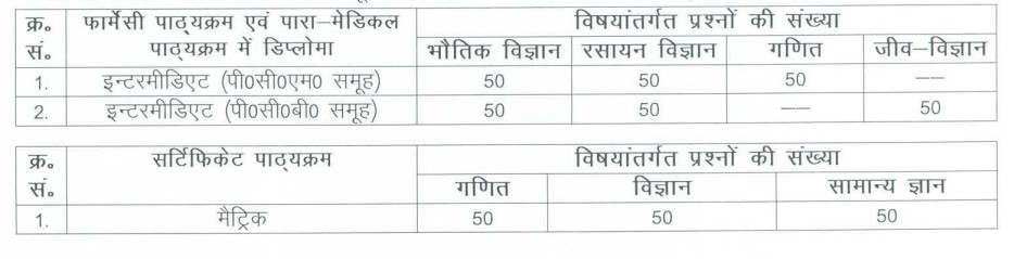 परीक्षा का स्तर एवं प्रकार (Exam Pattern/Syllabus) :- इंटरमीडिएड स्तरीय फार्मेसी एवं पारा मेडिकल पाठ्यक्रमों नामांकन हेतु अनुशंसा के निमित्त एक सामान्य प्रतियोगिता परीक्षा आयोजित की जायेगी तथा मैट्रिक स्तरीय ड्रेसर / मेडिकल लैब अटेंडन्ट / रेडियोग्राफर अटडेन्ट के लिये अलग से एक प्रतियोगिता परीक्षा आयोजित की जायेगी। प्रश्न-पत्र वस्तुनिष्ठ (Objective) एवं बहुविकल्पीय (Multiple choice) प्रकृति के होंगे तथा सभी विषयों के प्रश्न पत्र द्विभाषी, अंग्रेजी एवं हिन्दी में होंगे इन्टरमीडिएट एवं मैट्रिक स्तरीय पाठ्यक्रमों में नामांकन में निमित्त प्रतियोगिता परीक्षाओं में विभिन्न विषयों के अंतर्गत पूछे जाने वाले प्रश्नों की संख्या निम्नवत होगी-
