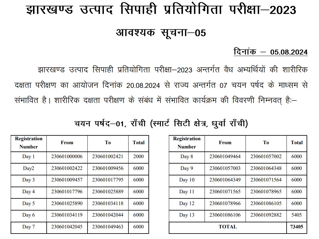 झारखण्ड उत्पाद सिपाही प्रतियोगिता परीक्षा-2023 अन्तर्गत वैध अभ्यर्थियों की शारीरिक दक्षता परीक्षण का आयोजन दिनांक 22.08.2024 से राज्य अन्तर्गत 07 चयन पर्षद के माध्सम से किया जाना निर्धारित है। शारीरिक दक्षता परीक्षण के संबंध में कार्यक्रम की विवरणी निम्नवत् है:-