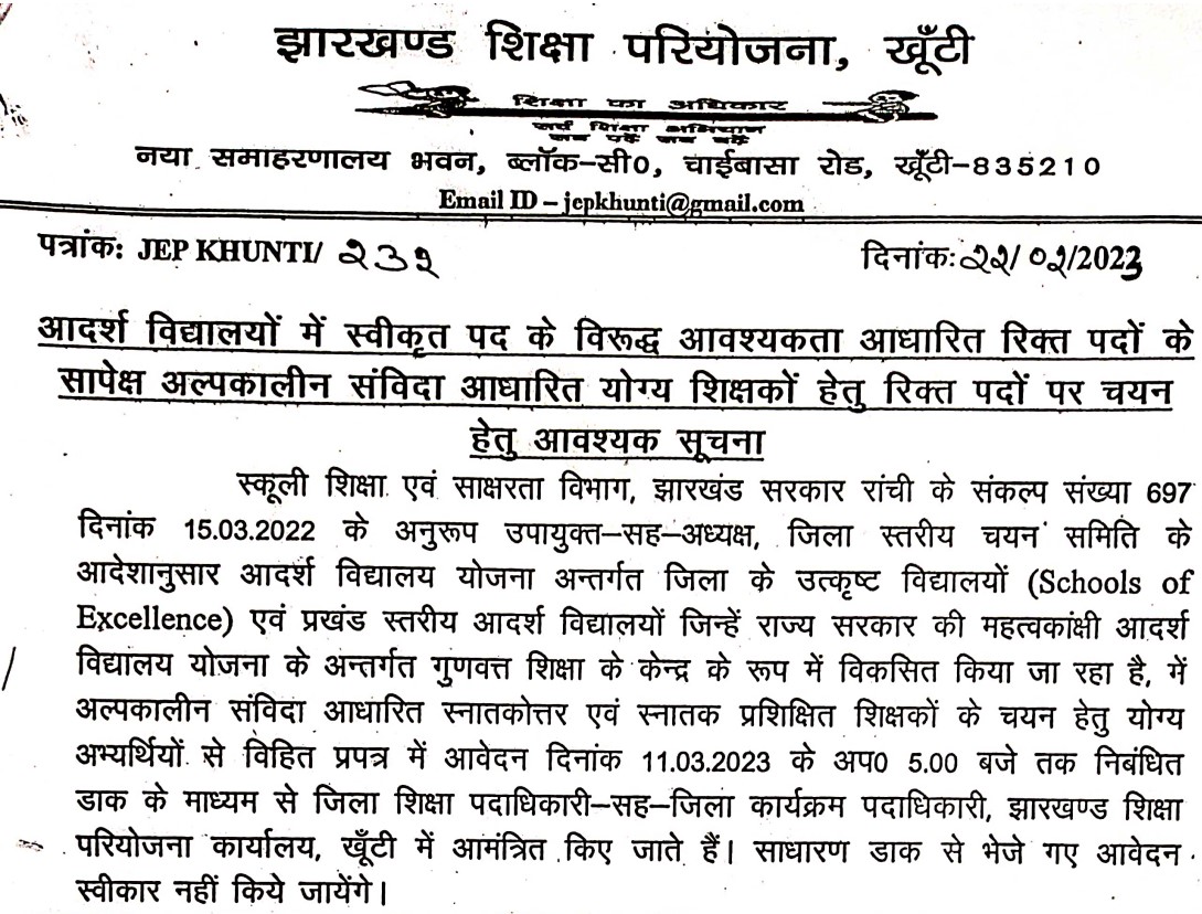 आर्दश विद्यालय योजना खूँटी अन्तर्गत जिले के उत्कृष्ट विद्यालयों ( Schools of Excellence) एवं प्रखण्ड स्तरीय आदर्श विद्यालयों में संविदा आधारित शिक्षकों के चयन हेतु आवश्यक