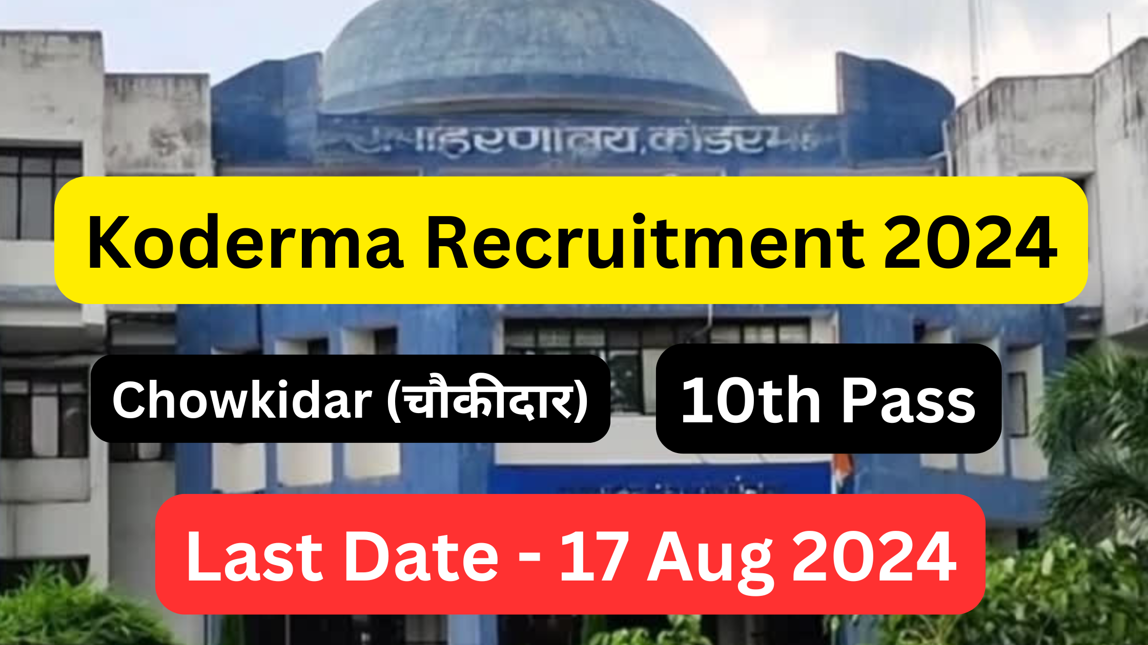 कोडरमा झारखण्ड जिला में बहुत लम्बे समय के बाद बेरोजगार युवा के लिए रोजगार का सुनेहरा अबसर आया है दुमका जिला के जिला दण्डाधिकारी-सह-उपायुक्त ने कोडरमा जिला अंतर्गत चौकीदार पद पर भर्ती के लिए विज्ञापन जारी किया गया है । जिसमें में कुल 95 पद के भर्ती के लिए नोटिस जारी किया गया है। इस भर्ती में के लिए दसवीं पास युवा डाक के माध्यम से आवेदन कर सकते है।