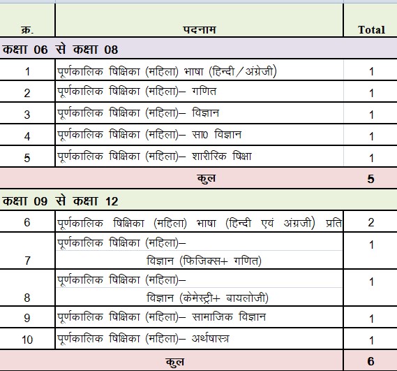 - मान्यता प्राप्त बोर्ड / विश्वविद्यालय से संबंधित विषय (जिस विषय की पूर्णकालिक शिक्षिका यथा क्रमांक 1 से 10 (कक्षा 6 से 8 हेतु 5 पद एवं कक्षा 9 से 12 हेतु 5 पद) पर अंकित पदों हेतु आवेदन किया जा रहा हो) में न्यूनतम 50 प्रतिशत अंक के साथ स्नातक की अहर्ता अनिवार्य है। अनुसूचित जाति/जनजाति एवं विकलांग कोटि के अभ्यर्थियों को इस नियम में उपरोक्त वर्णित न्यूनतम प्राप्तांक में 5 प्रतिशत की छूट दी जाएगी। चयन में उच्चतर शैक्षणिक योग्यता, प्राप्तांक को प्राथमिकता दी जाएगी।