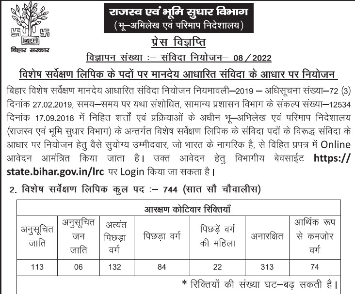 राजस्व एवं भूमि सुधार विभाग (LRC Bihar ) के अन्तर्गत विशेष सर्वेक्षण लिपिक के संविदा पदों के विरूद्ध संविदा के आधार पर नियोजन हेतु वैसे सुयोग्य उम्मीदवार जो भारत के नागरिक है, से विहित प्रपत्र में Online आवेदन आमंत्रित किया जाता है। उक्त आवेदन हेतु विभागीय बेवसाईट https://state.bihar.gov.in/ire पर Login किया जा सकता है।