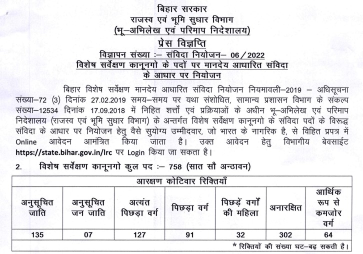 भू-अभिलेख एवं परिमाप निदेशालय (राजस्व एवं भूमि सुधार विभाग) (LRC Bihar )के अन्तर्गत विशेष सर्वेक्षण कानूनगो के संविदा पदों के विरूद्ध संविदा के आधार पर नियोजन हेतु वैसे सुयोग्य उम्मीदवार जो भारत के नागरिक है, से विहित प्रपत्र में Online आवेदन आमंत्रित किया है। उक्त आवेदन हेतु विभागीय बेवसाईट https://state.bihar.gov.in/Ire पर Login किया जा सकता है।