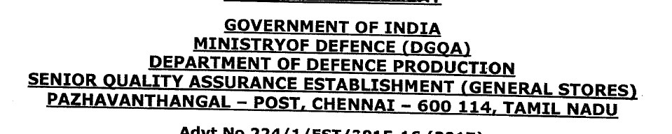 Applicantion Are invited from Indian Nationals for recruitment of the following vacancies of General Central Service ‘C’ Non – Gazetted posts at Senior Quality Assurance Establishment (GS) , Pazhavanthangal , – Post ,Chennai – 600114(Tamil Nadu) . Complete applications along with requisite details should reach the addressee within 21days form the date of publication of this advertisement :-