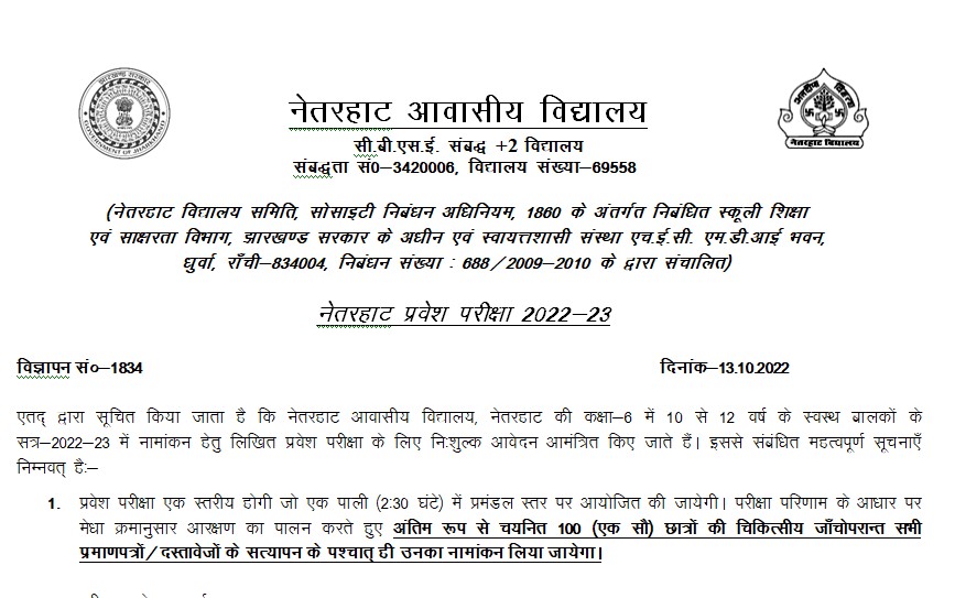 नेतरहाट आवासीय विद्यालय, नेतरहाट की कक्षा-6 में 10 से 12 वर्ष के स्वस्थ बालकों के सत्र-2022-23 में नामांकन हेतु लिखित प्रवेश परीक्षा के लिए निःशुल्क आवेदन आमंत्रित किए जाते हैं। इससे संबंधित महत्वपूर्ण सूचनाएँ निम्नवत् हैः-