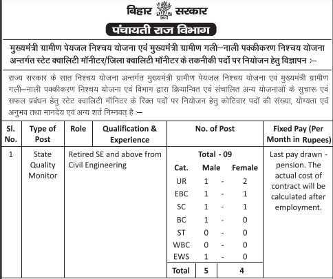 राज्य सरकार के सात निश्चय योजना अन्तर्गत मुख्यमंत्री ग्रामीण पेयजल निश्चय योजना एवं मुख्यमंत्री ग्रामीण गली-नाली पक्कीकरण निश्चय योजना एवं विभाग द्वारा क्रियान्वित एवं संचालित अन्य योजनाओं के सुचारू एवं सफल प्रबंधन हेतु स्टेट क्वालिटी मॉनिटर के रिक्त पदों पर नियोजन हेतु कोटिवार पदों की संख्या, योग्यता एवं अनुभव तथा मानदेय एवं अन्य शर्त निम्नवत् है: