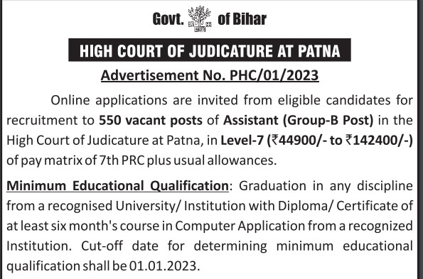 Online applications are invited from eligible candidates for recruitment to 550 vacant posts of Assistant (Group-B post) in the High COurt of Judicature at Patna in Level – 7 (Rs.44900/- to Rs.142400/-) of Pay matric of 7th PRC plus usual allowances .