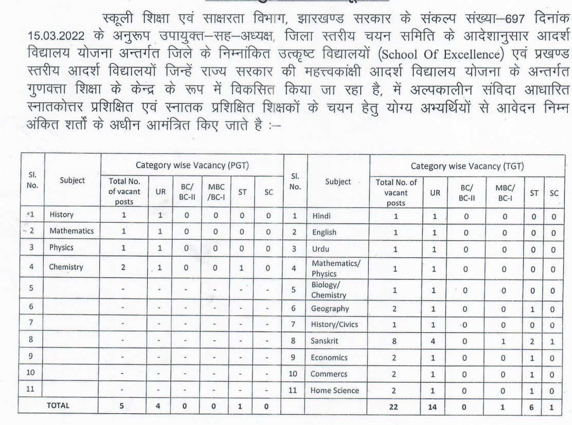 आर्दश विद्यालय योजना अन्तर्गत जिले के उत्कृष्ट विद्यालयों ( Schools of Excellence) एवं प्रखण्ड स्तरीय आदर्श विद्यालयों में संविदा आधारित शिक्षकों के चयन हेतु आवश्यक