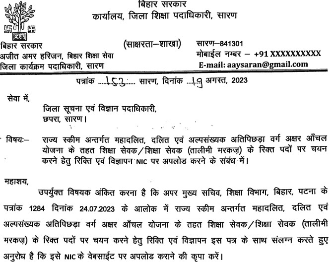 राज्य स्कीम अन्तर्गत महादलित, दलित एवं अल्पसंख्यक अतिपिछड़ा वर्ग अक्षर आँचल योजना के तहत शिक्षा सेवक / शिक्षा सेवक (तालीमी मरकज) के रिक्त पदों पर चयन हेतु इच्छुक अहर्त्ताधारी अभ्यार्थी अपना आवेदन दिनांक 21.08.2023 से 04.09.2023 तक संबंधित विद्यालय प्रधानाध्यापक के कार्यालय में जमा करा सकते है। समयावधि के समाप्ति के उपरांत प्राप्त आवेदन स्वीकार नहीं किया जायेगा। सभी अभ्यार्थियों को मार्गदर्शिका 2018 के कंडिका 04 जो पृष्ठ संख्या 04 पर अंकित दिशा निर्देश के आलोक में योग्य अभ्यार्थी आवेदन कर सकते है। साक्षरता, शिक्षा या सरकार की किसी योजना में कम से कम छः माह या उससे अधिक समय तक काम करने वाले अभ्यार्थियों को अतिरिक्त अंक दिया जायगा। साथ ही आवेदन के साथ शैक्षणिक / प्रशैक्षणिक अंक पत्र एवं प्रमाण-पत्र, जाति प्रमाण-पत्र, अवासीय प्रमाण-पत्र एवं आधार कार्ड की स्वअभिप्रमाणित छायाप्रति अवश्य संलग्न करेगें।